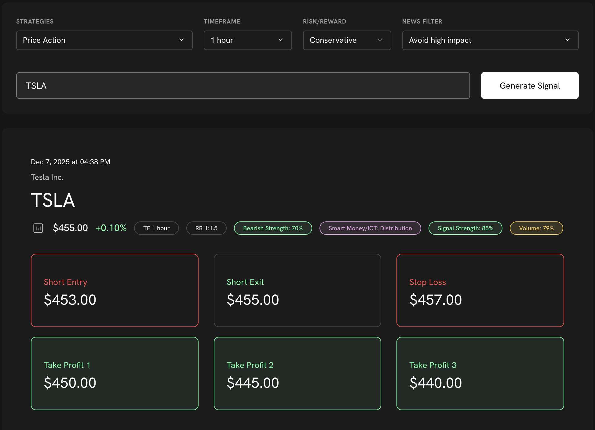Simply select or create a strategy, choose the asset and timeframe, set your risk-reward and filters, and click generate. Comps instantly produces a structured signal with entry, exit, targets, stop loss, and analysis.