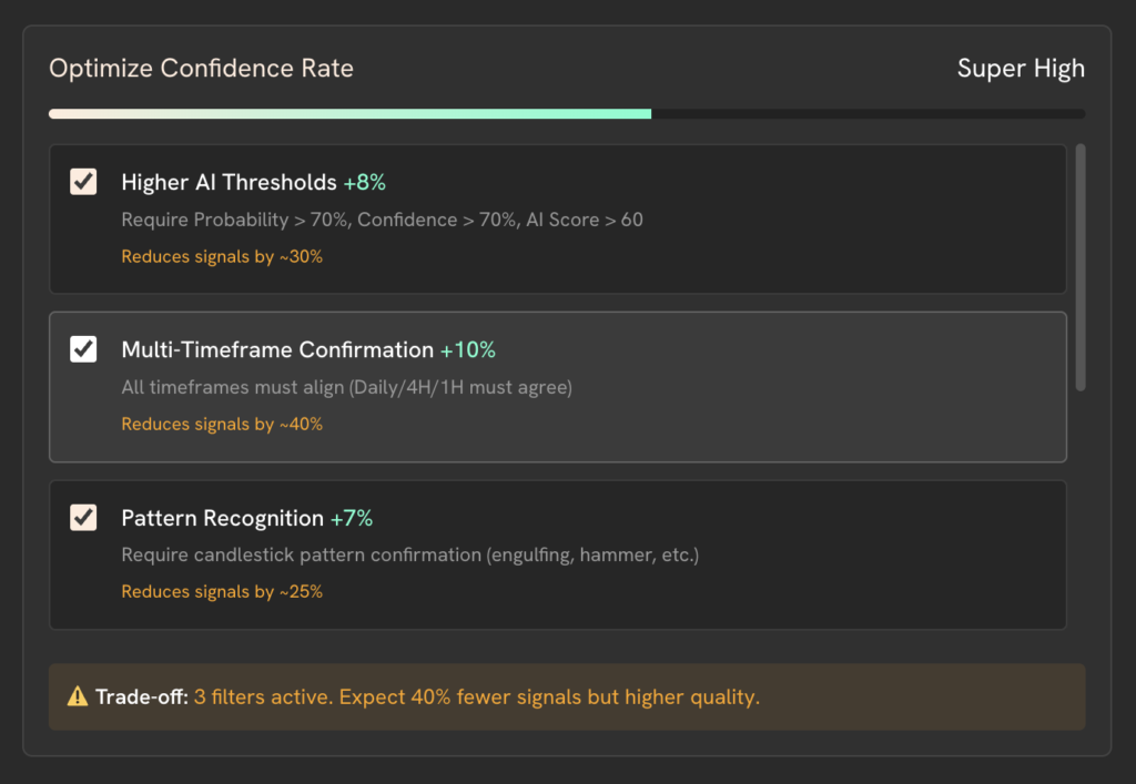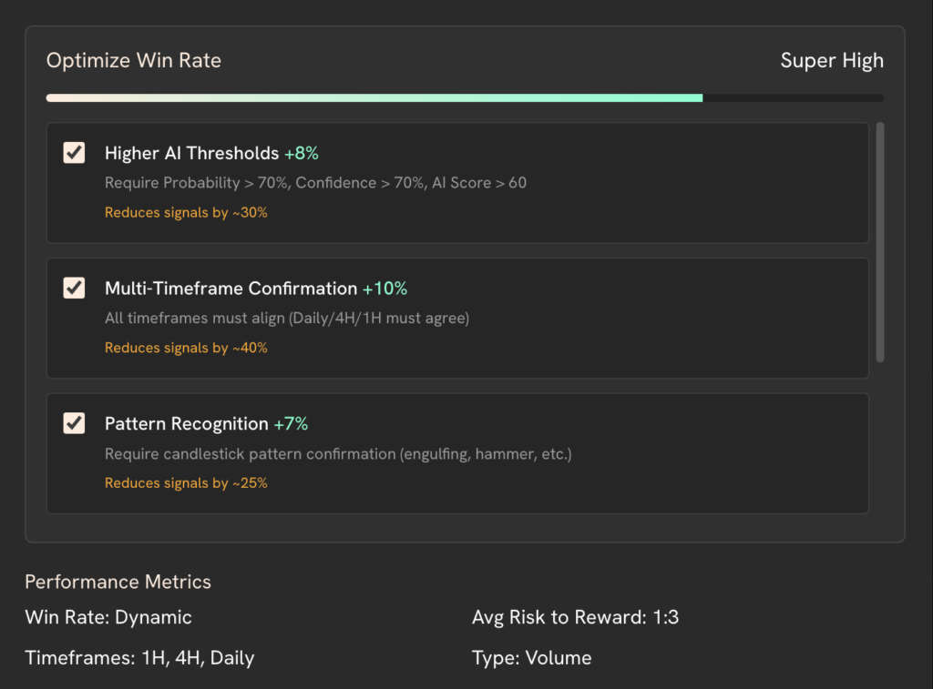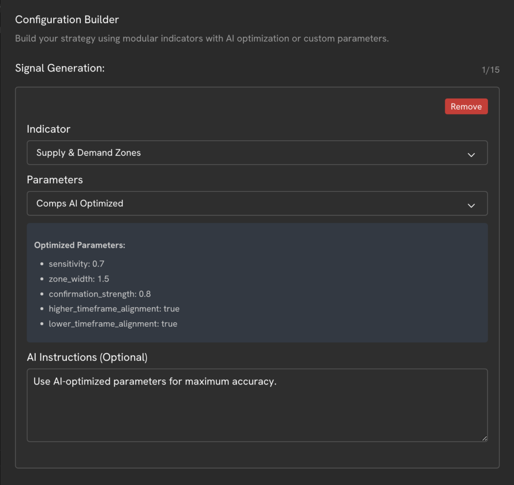 Add AI instructions, confirmation logic, and signal-analysis rules to build highly specific, high-confidence strategies tailored to your trading approach.