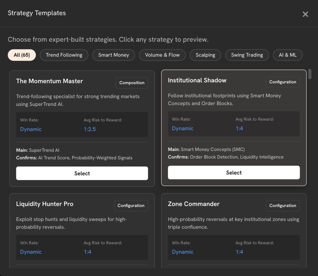 Access a deep library of tools — including 80+ AI indicators, 25+ quant systems, 65+ strategy templates, 25+ AI instruction templates, and 25+ trade analyst templates — to build and refine your approach.